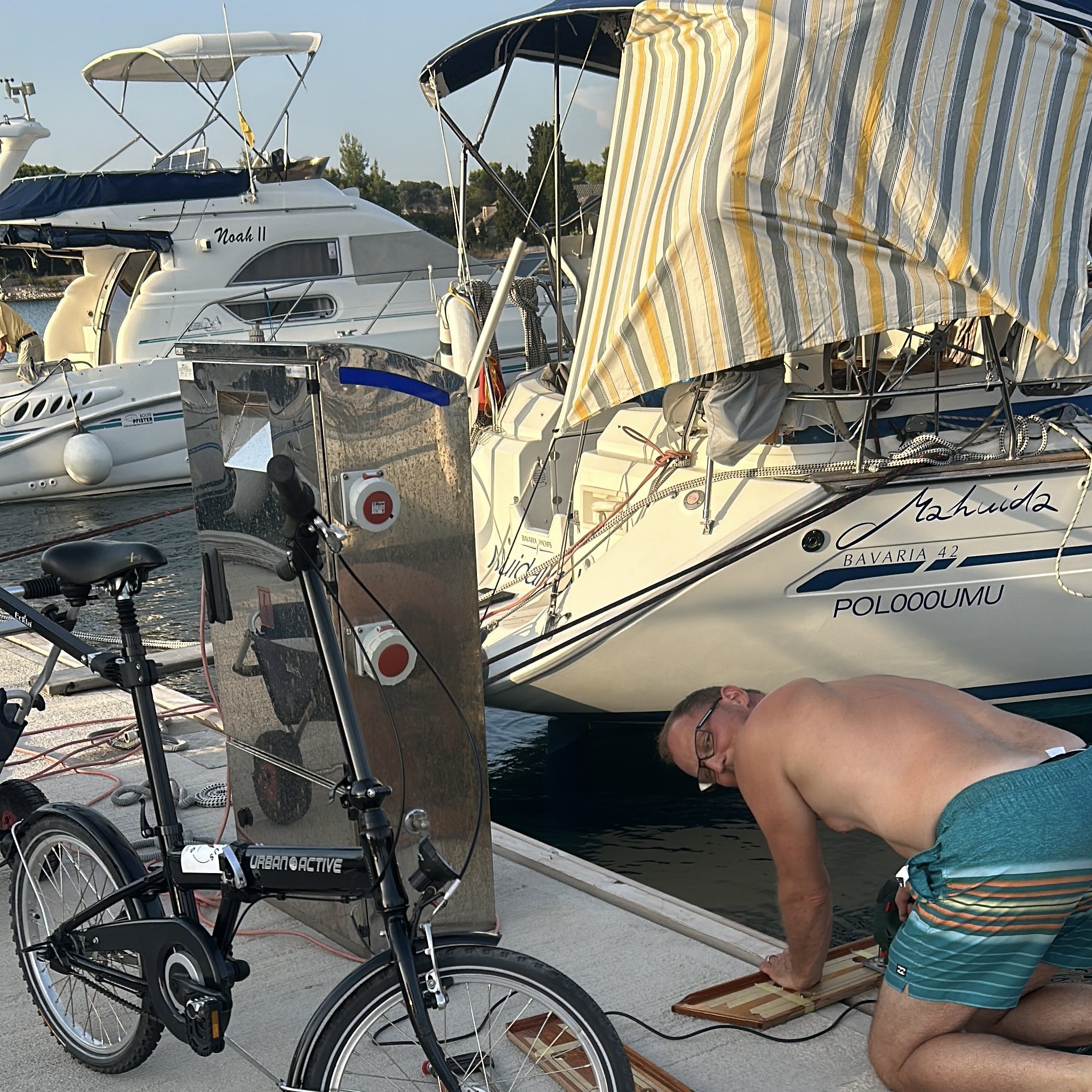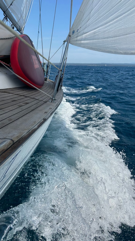 Bis zu diesem Aufbrechen in Muggia konnten wir viele weitere Arbeiten erledigen. Für manche reichte die Zeit nicht mehr, doch segeln können wir. Zum Beispiel haben wir wackelnde Klampen (Festmacher) nachgeschraubt, gesucht, wo Regenwasser eindringt, Relingbolzen neu festgemacht und abgedichtet, das Bimini (Sonnendach) verstärkt und den Schwarzwassertank für die Dusche ersetzt. Den Cockpittisch optimiert Matthias jetzt, während wir in Pula sind und warten, bis das angekündigte Regenwetter und Gewitter vorüber ist.