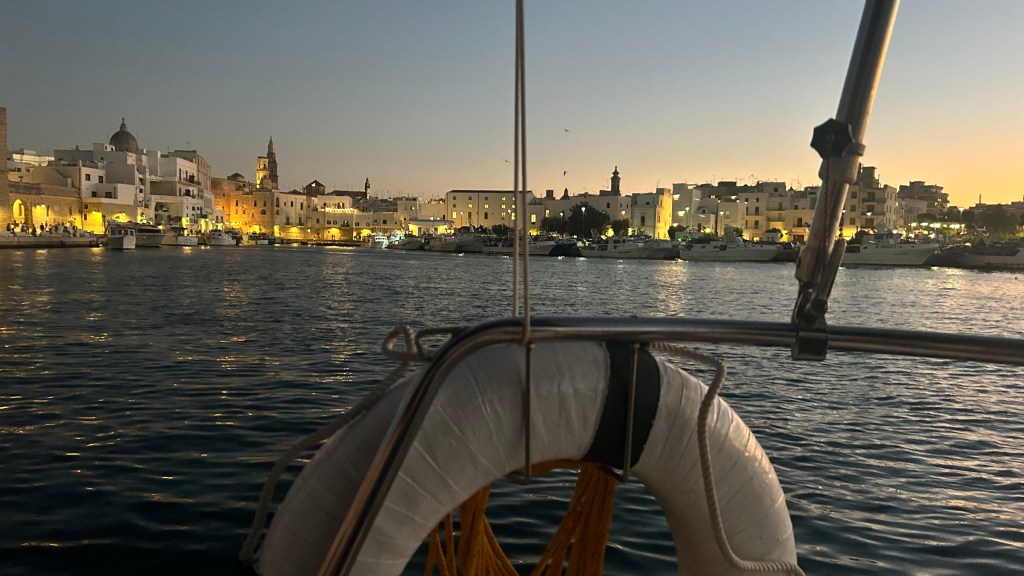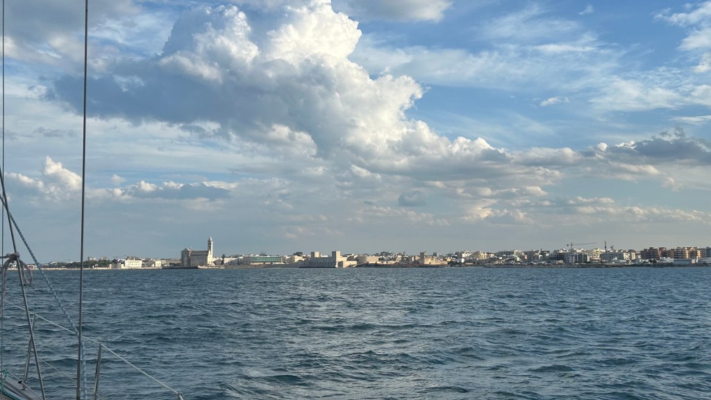 Wir habens geschafft! Sind in Korfu angekommen: 399 sm (Seemeilen, sind 718 km), vorwiegend mit Wind und Segel zurückgelegt. Gerade die beiden letzten Etappen von Brindisi nach Otranto (Italien) und dann weiter auf Erikoussa (Griechenland, Insel nördlich von Korfu) waren anspruchsvoll. Wir hatten viel Wind, meist um die 25 Knoten mit Böen bis 7 und 8 Beaufort. Das ist dann, wenn die Wellen immer höher werden, man nicht mehr darüber hinweg den Horizont sieht und Gischt über das Schiff kommt. Diese beiden Schläge von Brindisi über Otranto nach Erikoussa mussten wir am Die machen, da vorher und nachher noch stärkerer Wind war oder Südwind, welcher genau von vorne gekommen wäre. Es hätte dann zeitlich nicht gereicht gegen einen Südwind, der genau von vorne kommt, aufzukreuzen. Somit nutzten wir das kurze Wetterfenster und sind erleichtert und glücklich hier in Korfu zu sein. Der Vorteil war, dass wir schnell waren und gerade die lange Etappe von 60 sm (108 km) in nur 10,5 h meisterten.