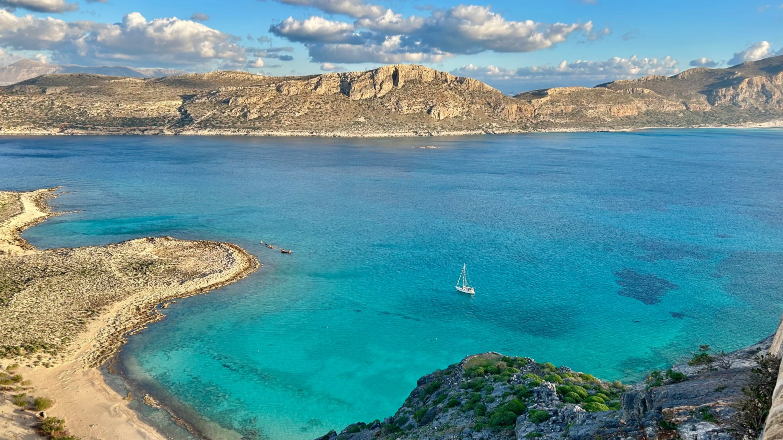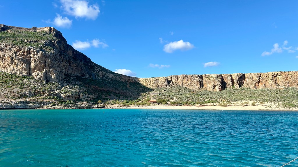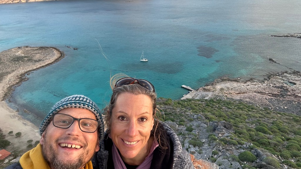 Auf dieser Etappe lernten wir viele schöne Orte kennen. Einer der schönsten war an Silvester Gramvousa, eine kleine Insel an der Westküste Kretas. Wir konnten fast nicht mehr aufhören zu staunen: Das türkis Wasser, warme Sonne, ein weiter Blick von den Klippen der Festung, unser Boot weit unten alleine, fast keine Leute, keine Touristen, wir alleine. Im Winter ist es in Griechenland viel familiärer. Chris und Theo campierten über Silvester an diesem schönen Ort und luden uns sehr freundschaftlich ein, mit ihnen zu feiern. Da wir am anderen Morgen eine lange Strecke geplant hatten, haben wir mit Raki angestossen und fuhren danach mit dem Dinghi vor dem Eindunkeln zurück auf unser Schiff.