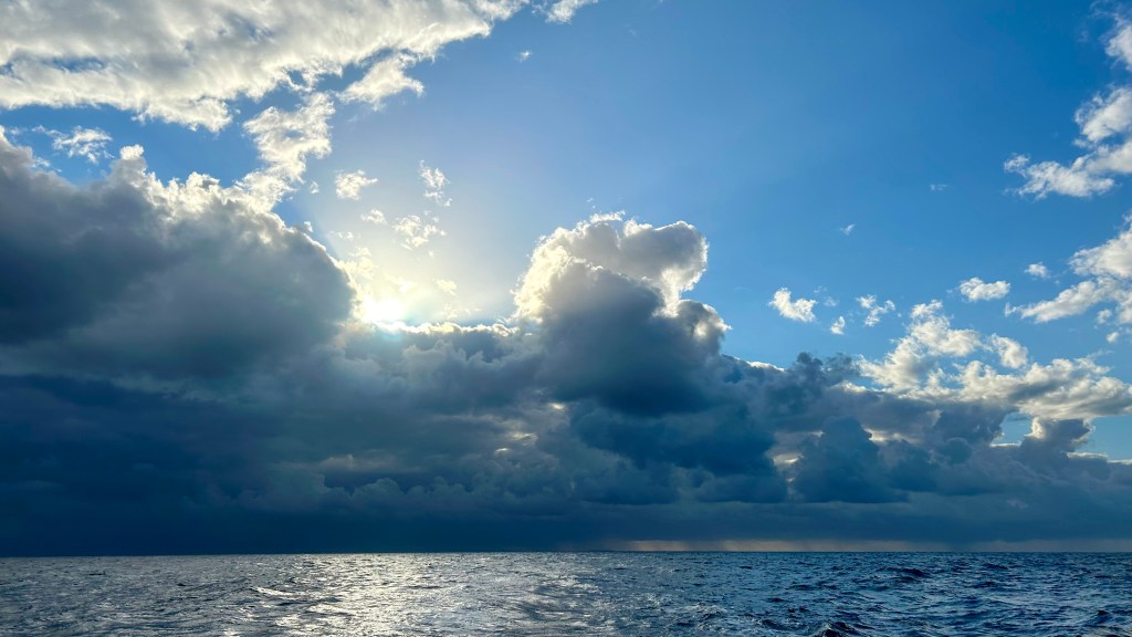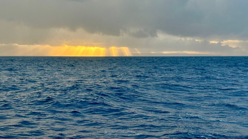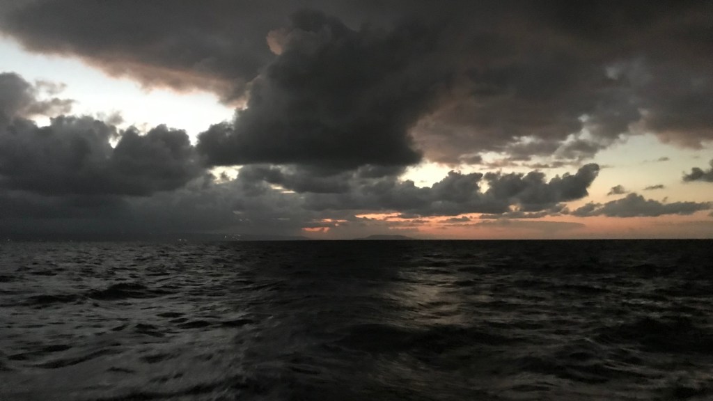 Heftige Regenzelle beim Kap Tainaron. Dieses Kap ist gefürchtet für heftige Windböen, was wir dann auch erlebten. Der Wind drehte von 5 auf über 20 Knoten auf. Da es vorher kein Wind hatte, waren die Segel zum Glück bereits unten.