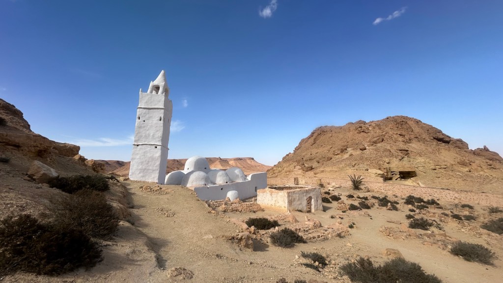 In einem Gemüseladen lernten wir die Schweizerin Ursula kennen. Sie schwärmte von der Wüste und gab uns wichtige und interessante Infos zum Land. Schliesslich fanden wir einen vertrauenswürdigen Chauffeur mit einem Auto, welcher uns zwei Tage in die Wüste begleitete. So sahen wir etwas mehr vom Reichtum des Landes: unendliche Olivenbaumplantagen, dann wieder Industriestädte, der Nationalpark in der Sahara, alte Berberdörfer, Oasen, römische Bauten und vieles mehr. Da die Tunesier sich mitten im Ramadan befanden, waren nicht viele Touristen unterwegs. Die meisten Restaurants waren abends geschlossen, was uns besonders auf der Reise in die Wüste zum Verhängnis wurde. Doch ein Barkeeper erbarmte sich und gab uns von seinem privaten Essen. Hungrig wie wir waren, schätzten wir diese nette Geste enorm! Die Reise in die Sahara, ca. 500 km hin und wieder zurück, war ein Highlight. Wir waren im Berberdorf Chinin, spazierten über eine Sanddüne und übernachteten in einer Höhle. Zum Teil wohnen Berber immer noch in Höhlen, da das Klima sehr angenehm ist. Draussen brütend heiss und in der Höhle im Winter warm und im Sommer angenehm kühl. In Chinin lernten wir Ali den Berber kennen, der uns für ein paar Dinar zu allen Sehenswürdigkeiten führte. Wir waren der Kultur sehr nahe, indem wir Ali viel fragen konnten und aber auch die Sicht von Hakim dem Chauffeur erfuhren. Ali war ziemlich hyperaktiv und sprach sehr schnell und vom Anfang bis zum Schluss ohne Pause. Es war immer lustig, wenn unsere verschiedene Kulturen zusammenkamen. Zuerst zeigte er uns Berbergräber und eine kleine schiefe Moschee, die sich anscheinend absichtlich nach Mekka neigen soll. Wir waren etwas skeptisch, bis ich Olivia dann mehrmals wünschte, doch noch Sand zu sehen. Nach der Erkundung des wunderschönen in den Berg gebauten Berberdorfs schaffte es Ali schliesslich, den Chauffeur Hakim zu überreden, eine kleine Strasse bis zum Beginn der Sandwüste zu fahren. Hakim steuerte seinen schönen weissen VW auf die holprige Wüstenpiste und fürchtete bereits den Tadel seines Chefs. Die Sandwüste war wunderschön!