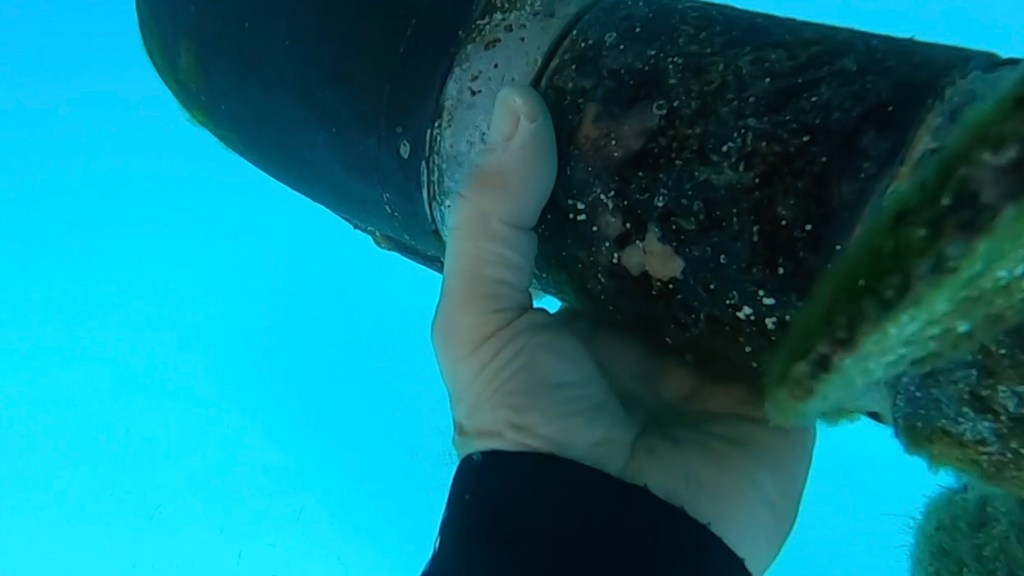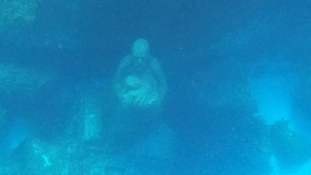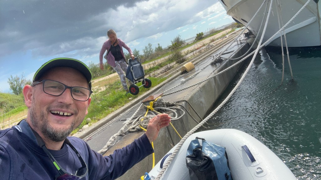 Ja, kurz vorher waren wir nicht so „gechillt“. Wir erkundeten mit dem Dinghi die Bucht, fanden die Madonna unter Wasser, fotografierten imposante Felsformationen und genossen das türkisfarbene Wasser. Abschliessend wollten wir den Schiffsrumpf von Bewuchs befreien, doch das Wasser ist immer noch sehr kalt. So entschied sich Matthias „nur“ eine Kontrolle zu machen. Er fasste das Propellerlager an und es liess sich zu fest und ungut bewegen. Erschrocken tauchte er auf, tauchte wiederholt unter, Olivia tauchte ebenfalls. Das fühlte sich nicht gut an. Wir beschlossen, dass das Schiff sofort aus dem Wasser gehoben werden muss. Sogleich versuchten wir die nächst gelegene Marina zu erreichen, nur 5 Meilen entfernt von unserer Bucht. Leider hatte das Büro bereits Feierabend. Hoffnungsvoll fuhren wir mit dem Dinghi an den Strand, um auf dem Landweg zur Marina zu gelangen. Vielleicht ist ja noch ein Arbeiter in der Werft…? Tatsächlich! Zwei Arbeiter schlossen in diesem Moment die Tür der Werft.