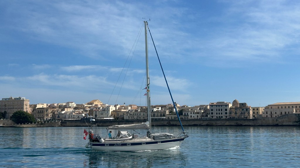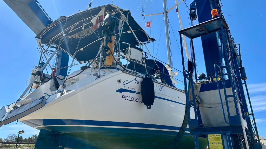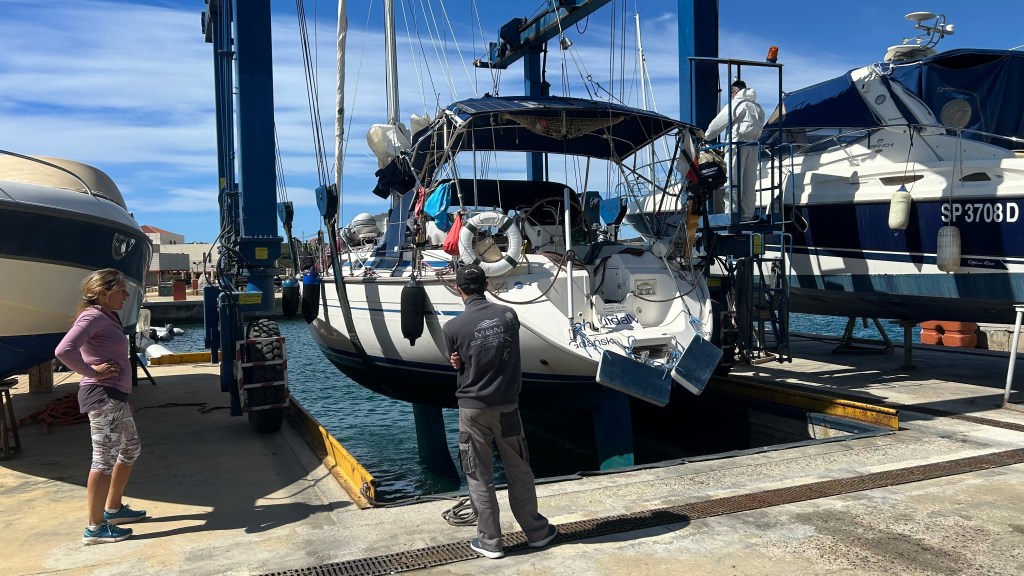 „Ob es ev. möglich wäre, unser Schiff auszukranen?“ – „Wann?“ – „Morgen…“ Sie hätten keinen Platz auf dem Land, doch wir sollen Morgen nochmals kommen, er werde es genauer abklären. Am nächsten Tag bestätigte uns der nette Werftarbeiter, dass sie unser Schiff um 10.00 Uhr auskranen können. Zurück auf unserem Schiff hoben wir den Anker ohne Motor, nur mit den Segeln. Dies gelang. Wir umsegelten das Capo Carbonara. Eine spannende Fahrt, mit viel Krängung, jedem erdenklichen Kurs (Vor dem Wind bis Hart am Wind) und durch „Steingärtchen“ hindurch. Vor dem Hafen warfen wir den Motor an, in der Hoffnung, den Propeller nicht zu verlieren. Ein Marinero half uns mit dem Dinghi bis in die Box des Krans. Zuerst sahen die Mechaniker nichts Bedenkliches, ausser einem verschraubten Teil, das sich anscheinend gelöst hat. Beim Zusammensetzen des Propellers bemerkten sie jedoch, dass eben dieser „Nabensatz“ völlig abgenutzt ist. Wir müssen ein solches Ersatzteil bestellen. Die Marina regelte alles für uns, bestellte das Ersatzteil so schnell wie möglich. Weil wir uns in einer Zeit von vielen Feiertagen befinden, wird es wahrscheinlich 10 Tage dauern, bis es eintreffen wird. So beschlossen wir, das Schiff wieder einzuwassern und im Hafen abzuwarten. Wir haben nun Zeit, einige Arbeiten am Schiff zu erledigen, die kommenden Törns zu planen, die Umgebung zu geniessen und eben diesen Blog zu schreiben! Wir sind sehr dankbar, dass dies hier passierte und nicht irgendwo unterwegs zwischen Sizilien und Sardinien während der 33 h Überfahrt. Wie diese Geschichte weitergeht, werden wir euch nächstes Mal schreiben.
