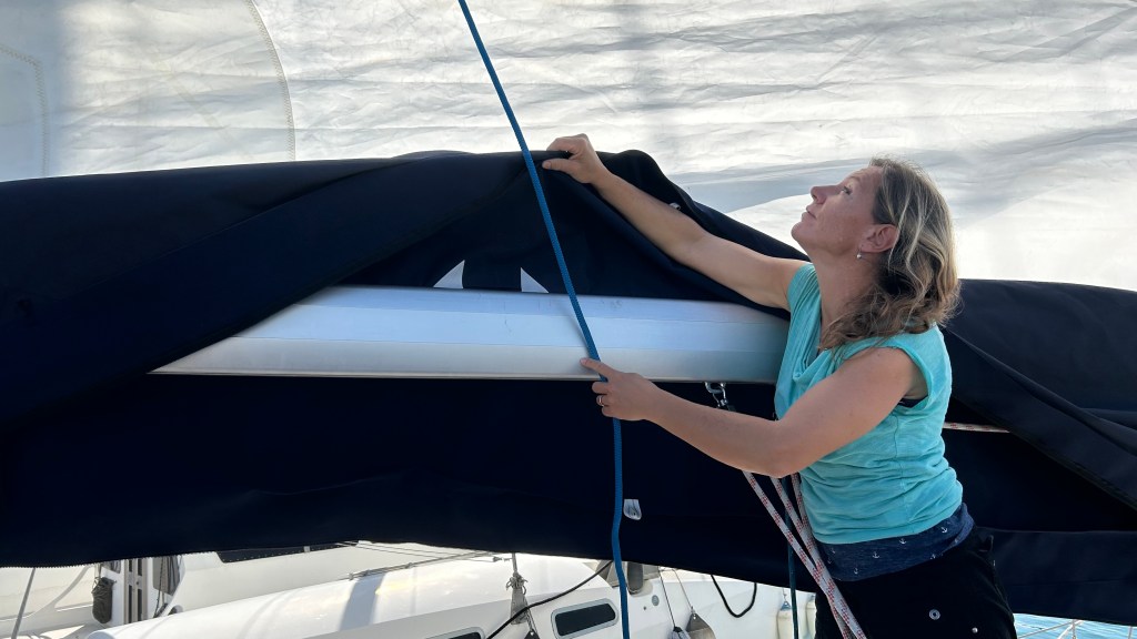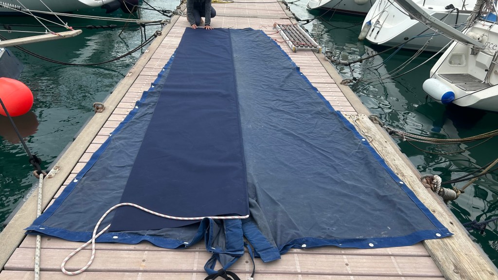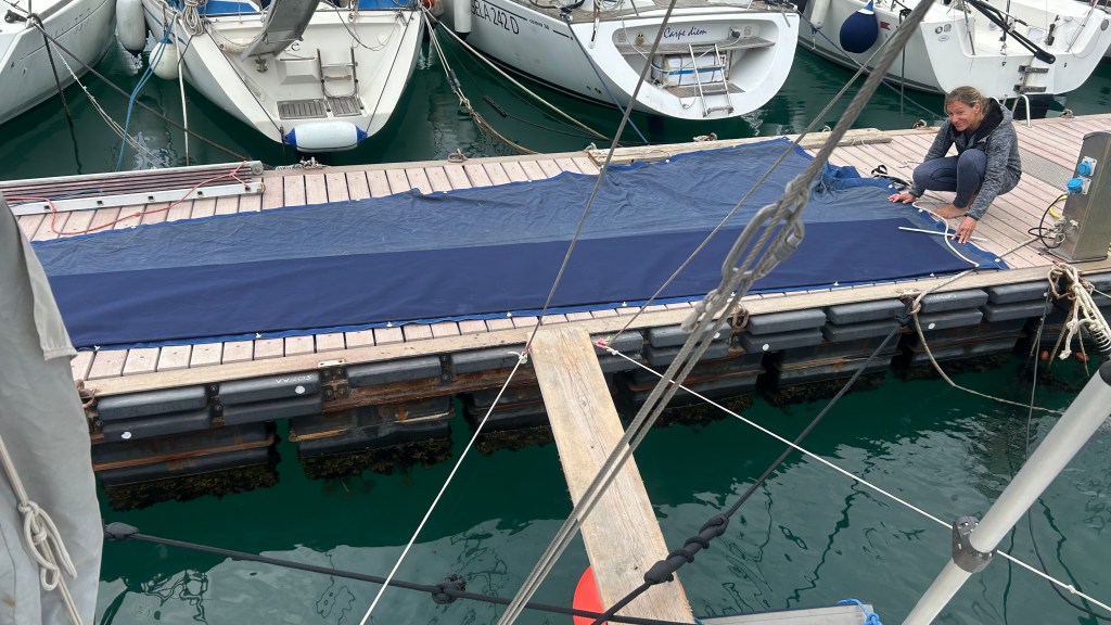 Projekt „Lazy Bag“: Wir wollten schon länger eine bequemere Tasche, um das Grosssegel einpacken zu können. Irgendwann hatte Olivia diese Idee, selber einen solchen Bag zu nähen, weil es gar nicht so schwierig aussah. Das Projekt wurde aber dann doch ziemlich gross. Wir liessen uns Stoff nach Catania bestellen und arbeiteten 3 volle Tage daran. Das Ergebnis ist ziemlich gut. Die Bewährungszeit ist noch nicht vorüber, es wird sich noch zeigen, wie lange er hält.