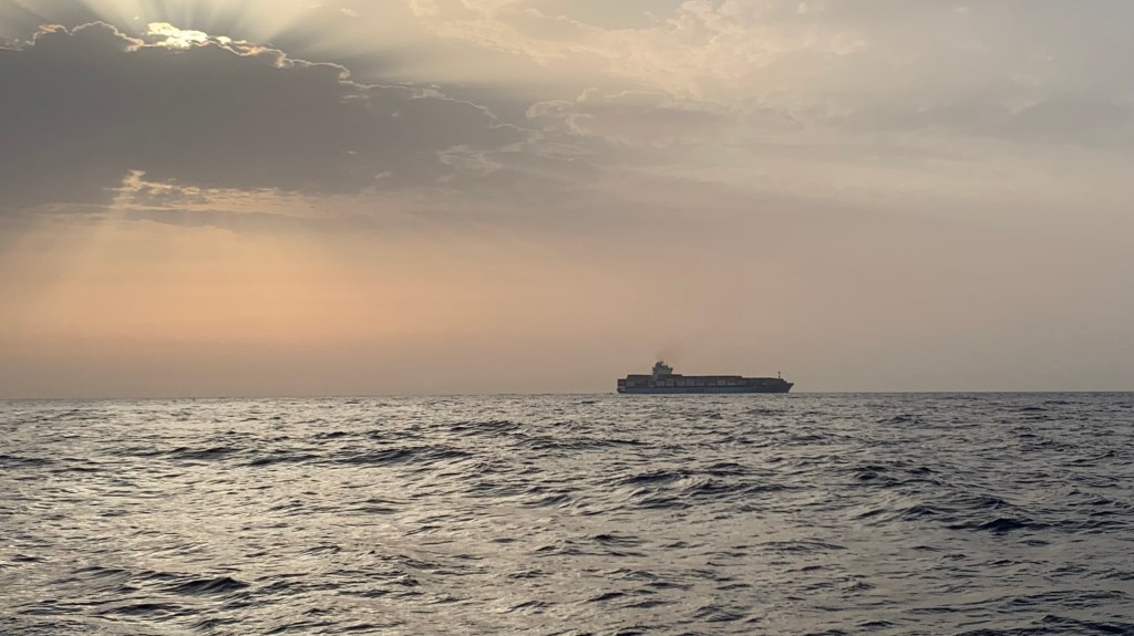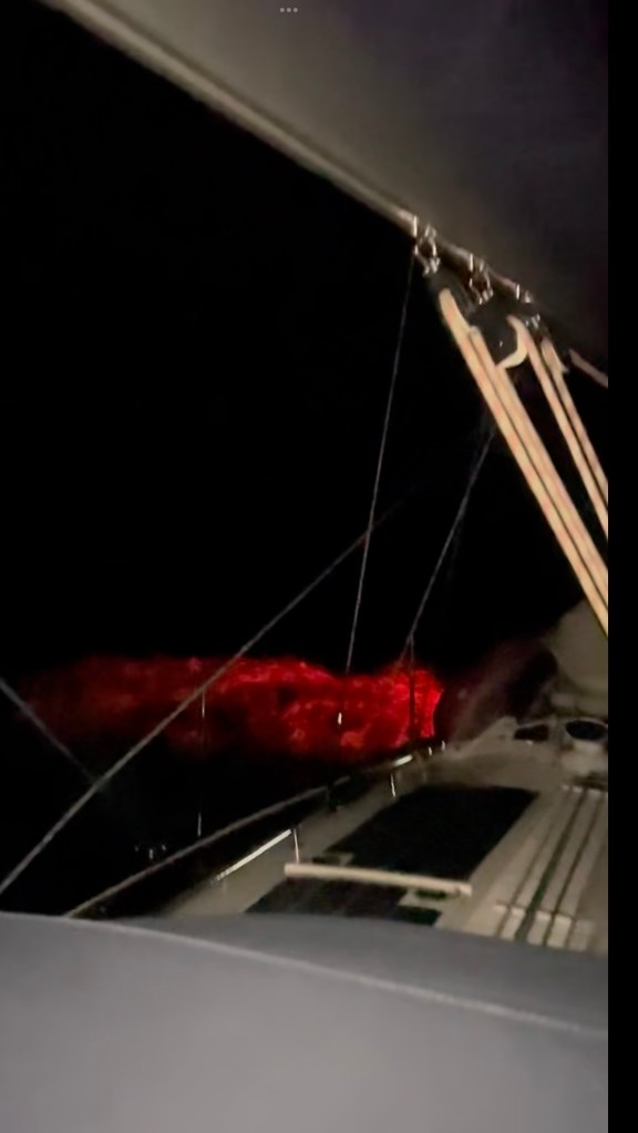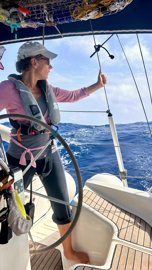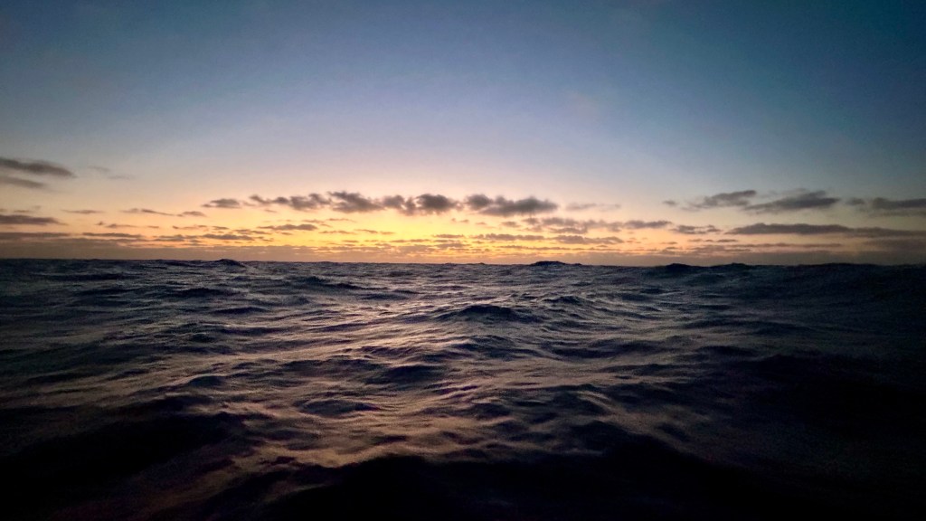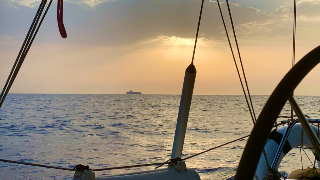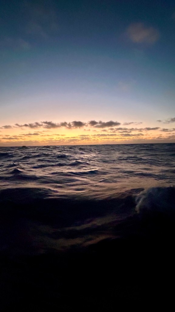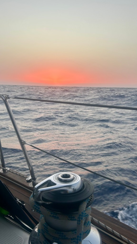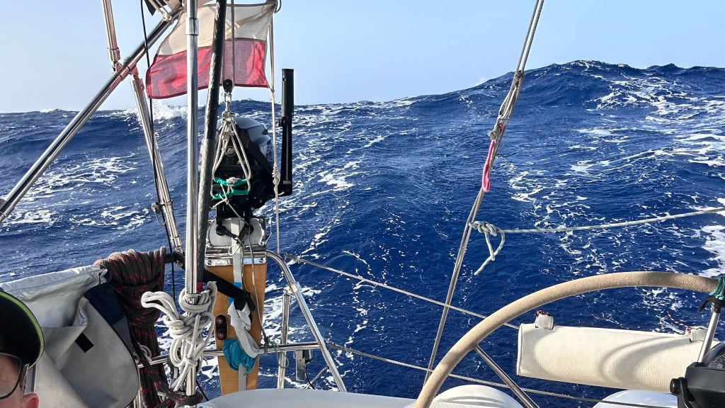Während der letzten Nacht kommt Olivia hoch ins Cockpit und sieht Matthias nach hinten starren. Es habe Wellen, die sich überschlagen und von hinten auf uns zurollen. Ein ungemütliches Gefühl, diesen weissen langen Strich auf uns zukommen zu sehen, dann das Rauschen und Blubbern zu spüren, das Schiff zittert. Es lässt sich jedoch nicht vom Kurs abbringen. Der Autopilot arbeitet kräftig und sehr zuverlässig, das Schiff gleitet geschickt durch die hohen Wellen. Nur etwa drei Wellen fliessen ins Cockpit hinein. Wir sind einmal mehr überzeugt, ein gutes und sicheres Schiff zu haben.