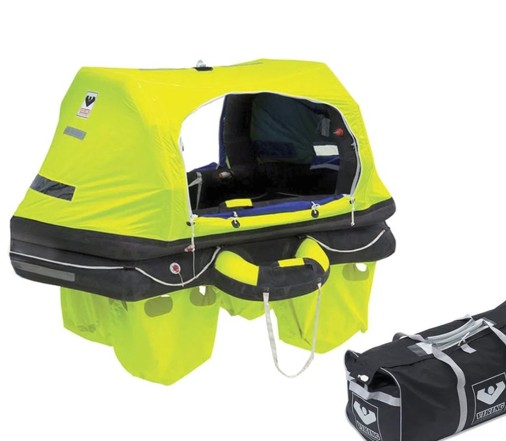 Rettungsinsel für 6 Personen. Sobald das Schiff in Gefahr ist zu sinken, wirft man diese über Bord. Sie bläst sich selber auf und es ist ein kleiner Notvorrat an Wasser enthalten.
