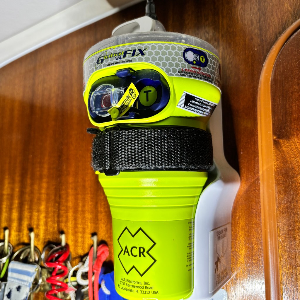 Die Epirb (Emergency Position Indicating Radio Beacon) ist eine Notfunkbacke. Sobald sie in Berührung mit Wasser kommt oder manuel ausgelöst wird, sendet sie ein Notsignal aus. Sie ist auf unser Schiff programmiert und würde in einer Notsituation zuerst alle Minuten, dann alle 10 Minuten die aktuelle Position senden.