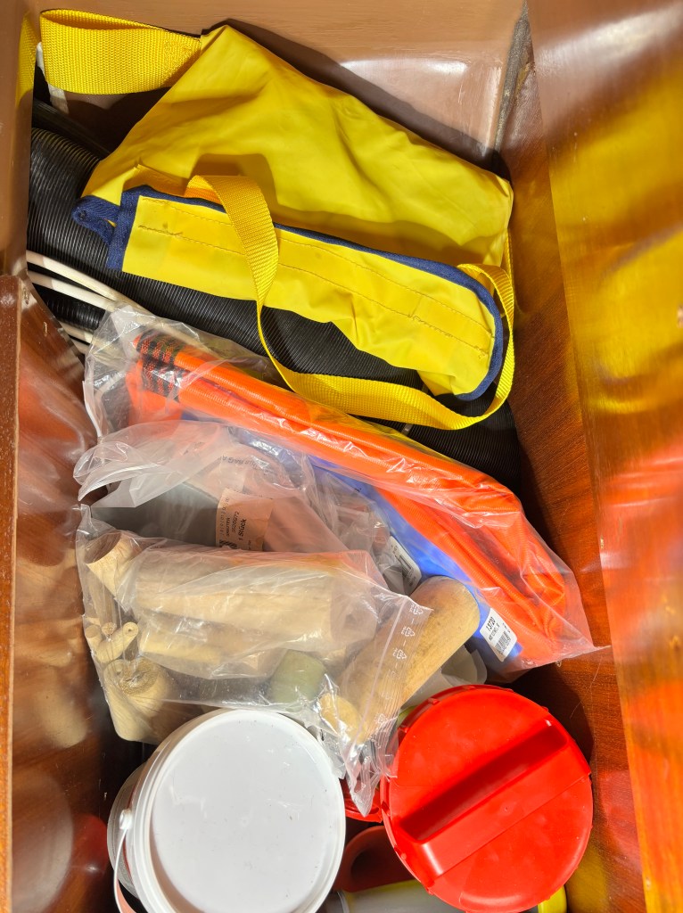 Im Kartentischsitz befinden sich diverse Rettungsutensilien wie Notleiter, Leuchtraketen, Treibanker, Leckmasse und Holzzapfen im Falle eines Lecks.