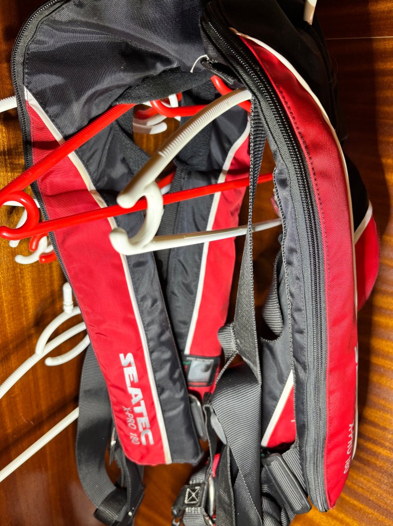 Natürlich sind auch 6 Rettungswesten an Bord (Seatec und Secumar). Sie blasen sich ebenfalls automatisch auf, sobald sie in Kontakt mit Wasser kommen.